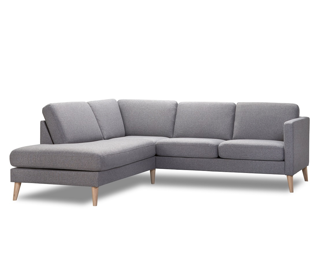Golf sofa med open end til venstre. Sofaen har en rigtig dejlig siddekomfort. Der er koldskum i sædehynderne og en fast skum i ryghynderne. Det betyder, at du ikke behøver banke hynderne op. I denne udgave er Golf sofaen monteret med lys grå stof og lyse