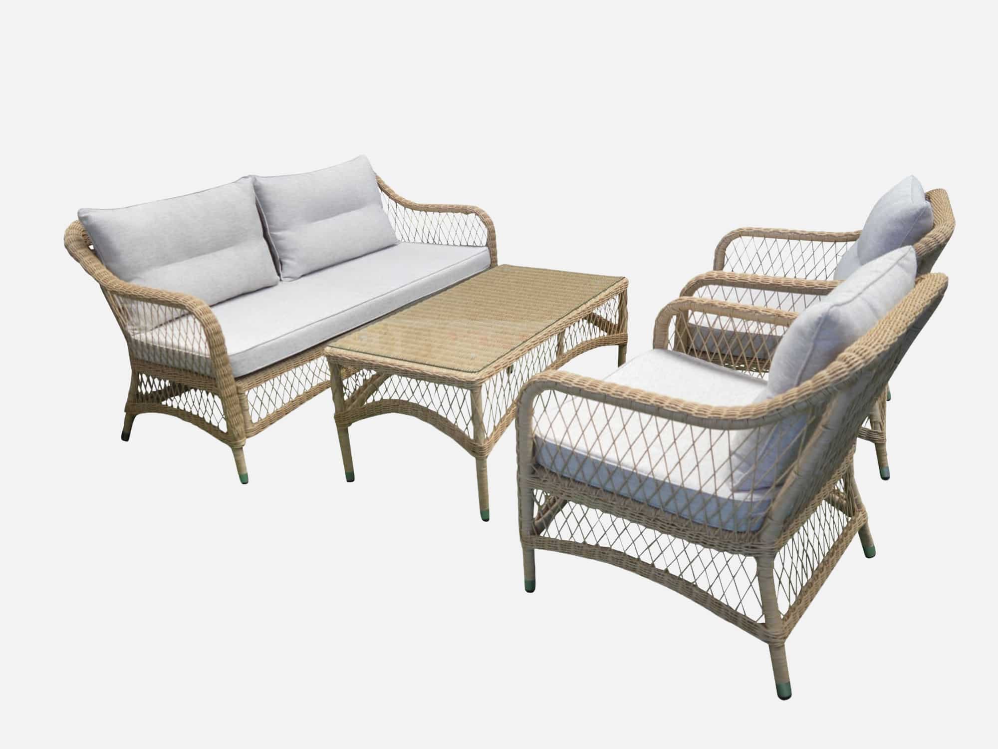 Loungesæt CairosLoungesæt Cairos består af 3 personers sofa. 2 loungestole og sofabord med hærdet glas. Sættes leveres komplet med Quick Dry hynder som kan tåle, at være ude i alt slags vejr. Disse hynder har en specialskum som hurtigt drænes for v