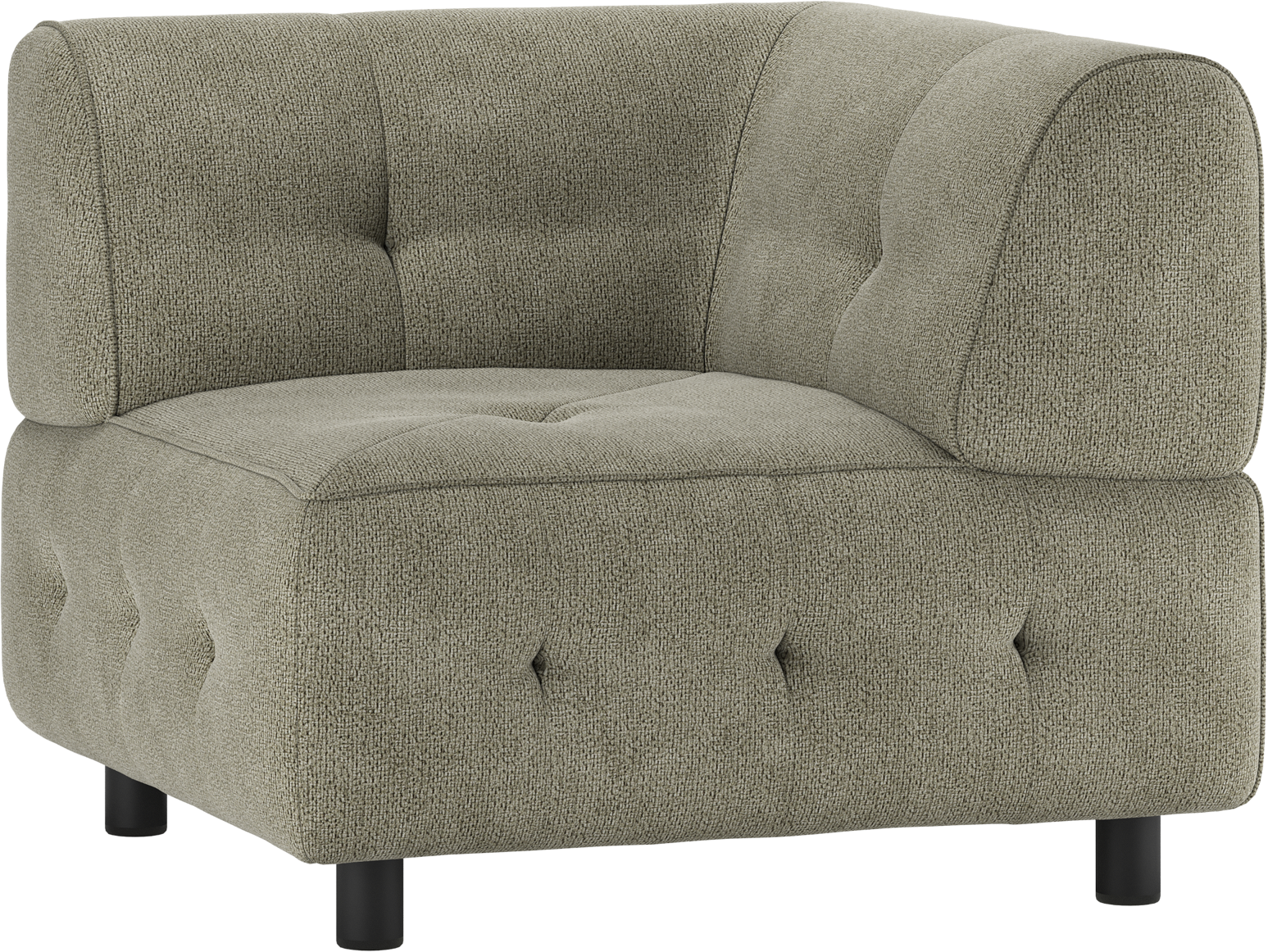 WOOOD præsenterer det modulære hjørneelement af deres Louis sofa serie. Som kommer i en luksuriøs chenille grøn farve. Dette elegante sofamodul måler 73 cm i højden. 90 cm i bredden og 90 cm i dybden. Hvilket gør det til en alsidig tilføjelse til enhver s