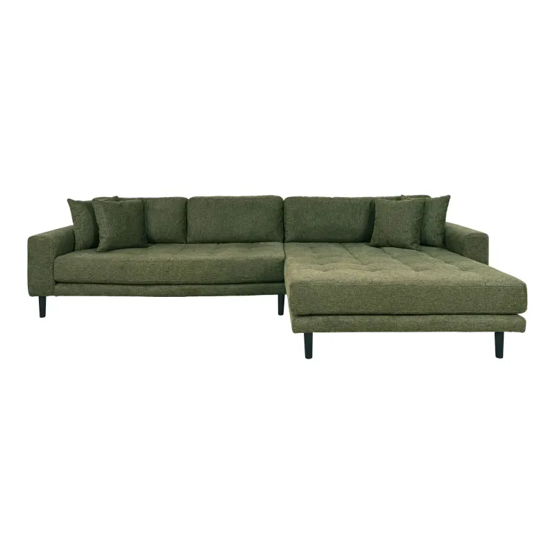 Lido lounge højrevendt sofa i olivengrøn – 1301480 Produktspecifikation. Sofa højrevendt i olivengrøn med fire puder HN1020 Materiale. 100 Polyester. Eg. Fyr Farve. Olivengrøn Længde cm. 170-92 Bredde cm. 290 Højde cm. 76 Nettovægt kg. 78. 2 S
