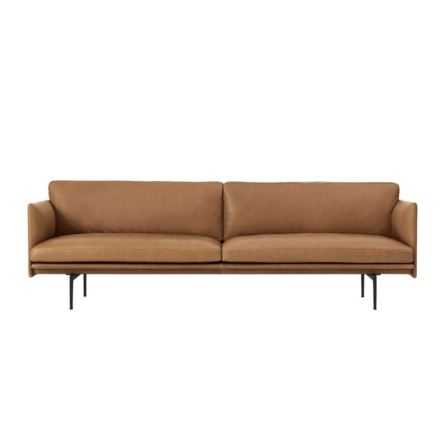 3 pers. Outline sofa fra Muuto. Sofaen fås både i tekstil og læder og her vist i cognac farvet Refine læder. Sofaen står på en ramme af sortlakeret aluminium. Alle hynder er håndsyet og er med koldskumsfyld. Sofaens design er en videre udvikling afde kl