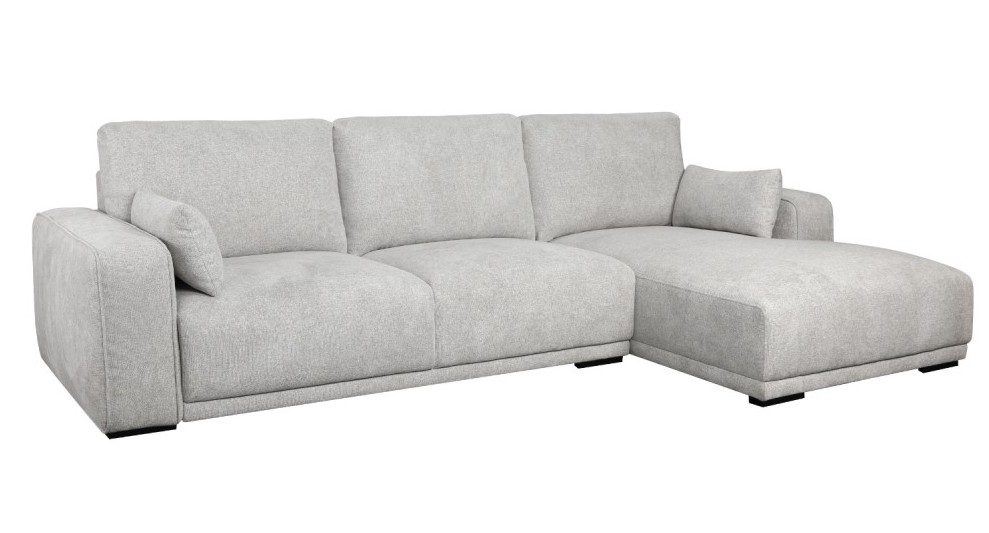 Santa Monica sofa med chaiselong til højre i gråt møbelstof med plads til 3 – 4 personer. Chaiselong er til højrepå sofaen findes også med chaiselong til venstre Siddehynder med koldskum og pocket fjedreeder sikrer en behagelig siddeoplevelse med g