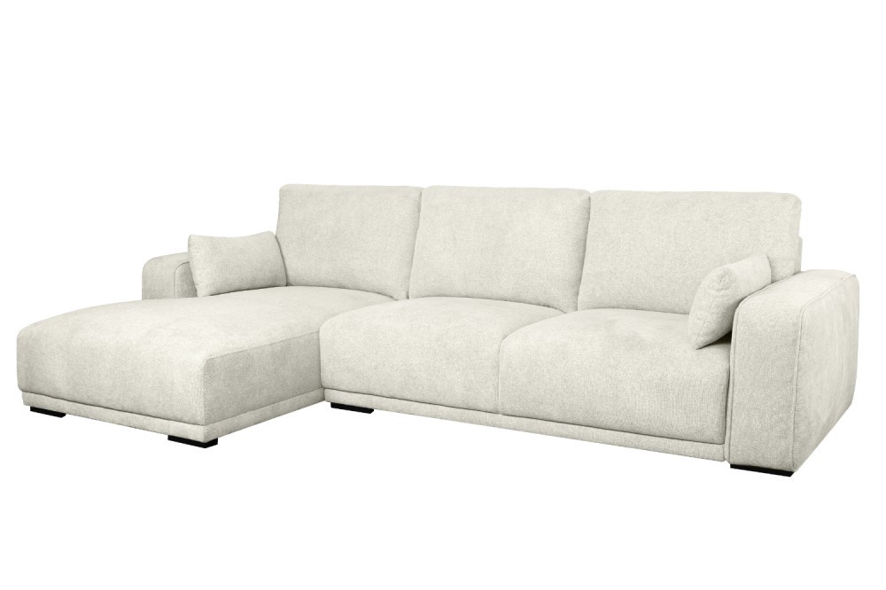 Santa Monica sofa med chaiselong til venstre i cremefarvet møbelstof med plads til 3 – 4 personer. Chaiselong er til venstre på sofaen findes også med chaiselong til højre Siddehynder med koldskum og pocket fjedreder sikrer en behagelig siddeoplevel
