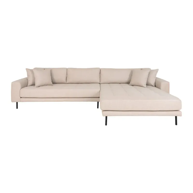 Lido Lounge højrevendt sofa i beige – 1301490 Produktspecifikation. Sofa højrevendt i beige med fire puder HN1025 Materiale. 100 Polyester. Fyr. Stål Steltype. Stålben Farve. Beige Længde cm. 170-92 Bredde cm. 290 Højde cm. 76 Nettovægt kg. 78
