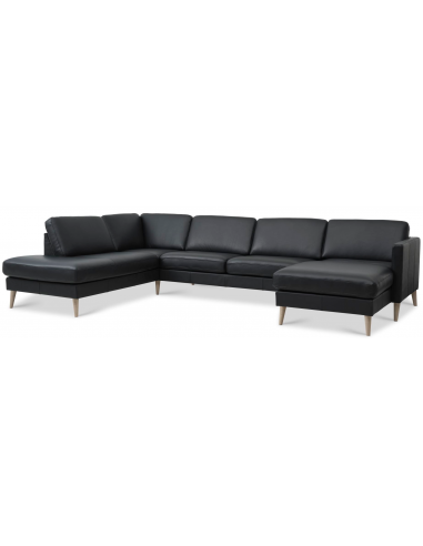 Askset venstrevendt U-sofa udført i et moderne og lækkert design med ben i naturfarvet træ og betræk i sort semi-anilin læder. Sofaen måler 336 cm i bredden og 152 – 219 cm i dybden og er polstret med fjedre og højkvalitets skum. Forventet leveringstid.